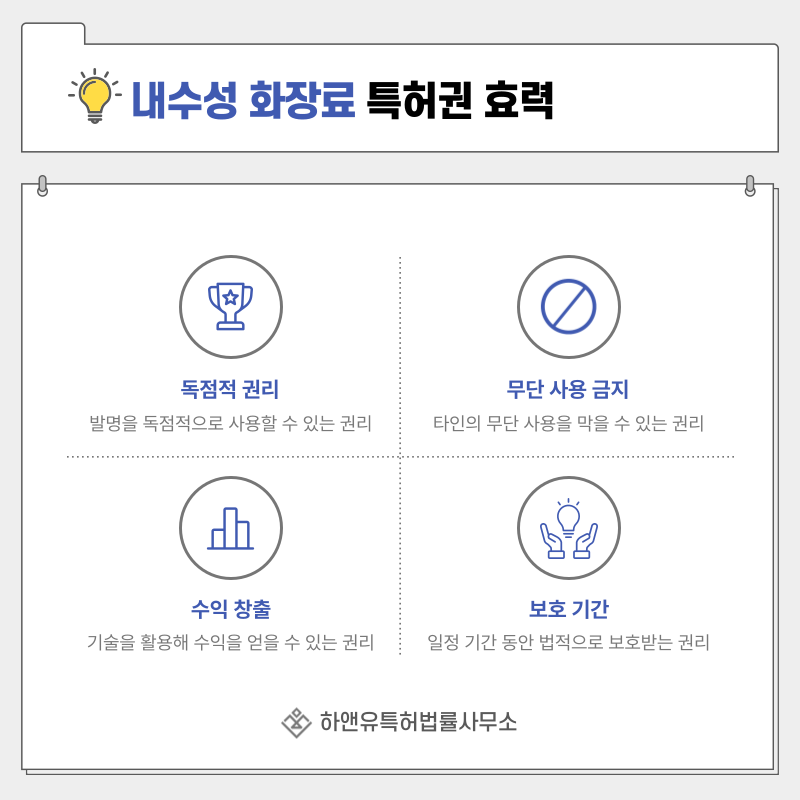등록된 이후에는 MQ 레진 코팅 구조나 내수성 화장료 기술에 대해 독점적 권리를 행사할 수 있습니다.
