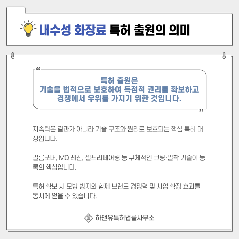 보호하는 것이 아니라, 메이크업 지속력을 구현하는 기술 구조와 원리를 권리로 확보하는 과정입니다.