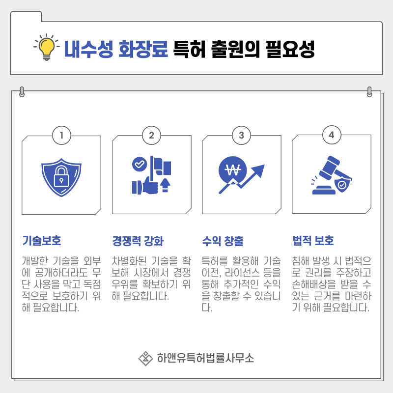 이 과정에서 발수성 색조 화장료나 내수성 화장료의 기술이 외부에 공개되므로 출원 시점 관리가 중요합니다.