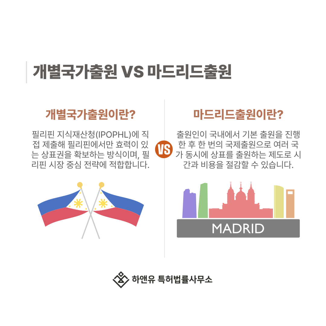 특히 필리핀 시장이 주요 진출 대상이거나 단일 국가 보호가 목적이라면 개별국가출원이 보다 효율적이고 명확한 권리 확보 방식입니다.