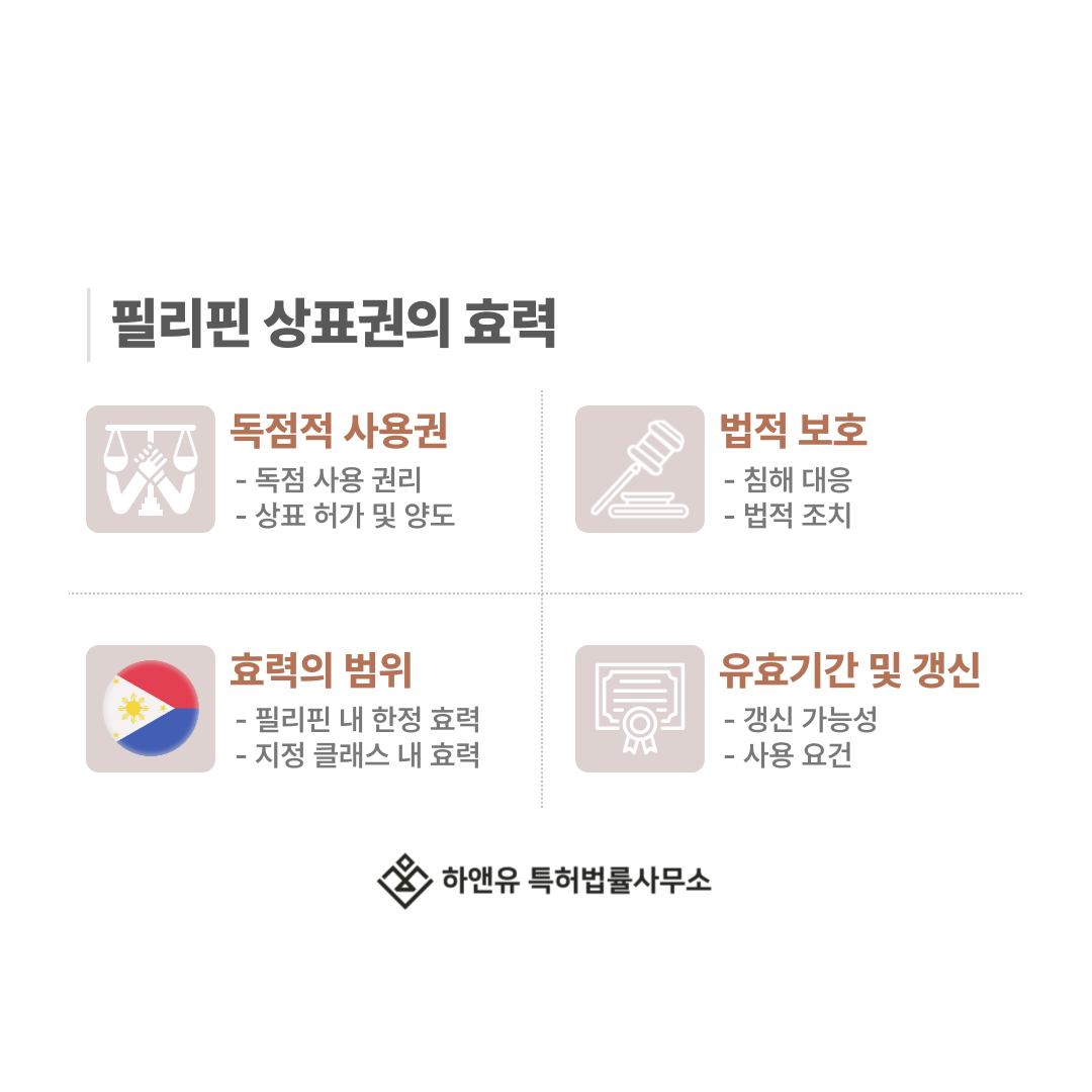 필리핀 상표권의 효력은 등록 시 지정한 상품류와 서비스 범위 내에서만 적용됩니다.