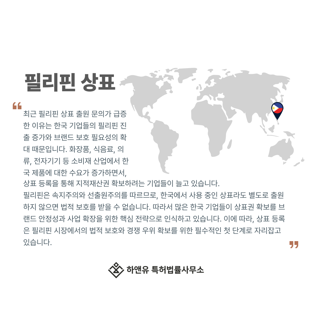#필리핀상표 #필리핀상표출원 #필리핀상표등록 #필리핀상표특허 #필리핀상표권 #해외출원 #해외상표출원 #마드리드출원 #하앤유특허법률사무소 #TrademarkRegistration #TrademarkApplication