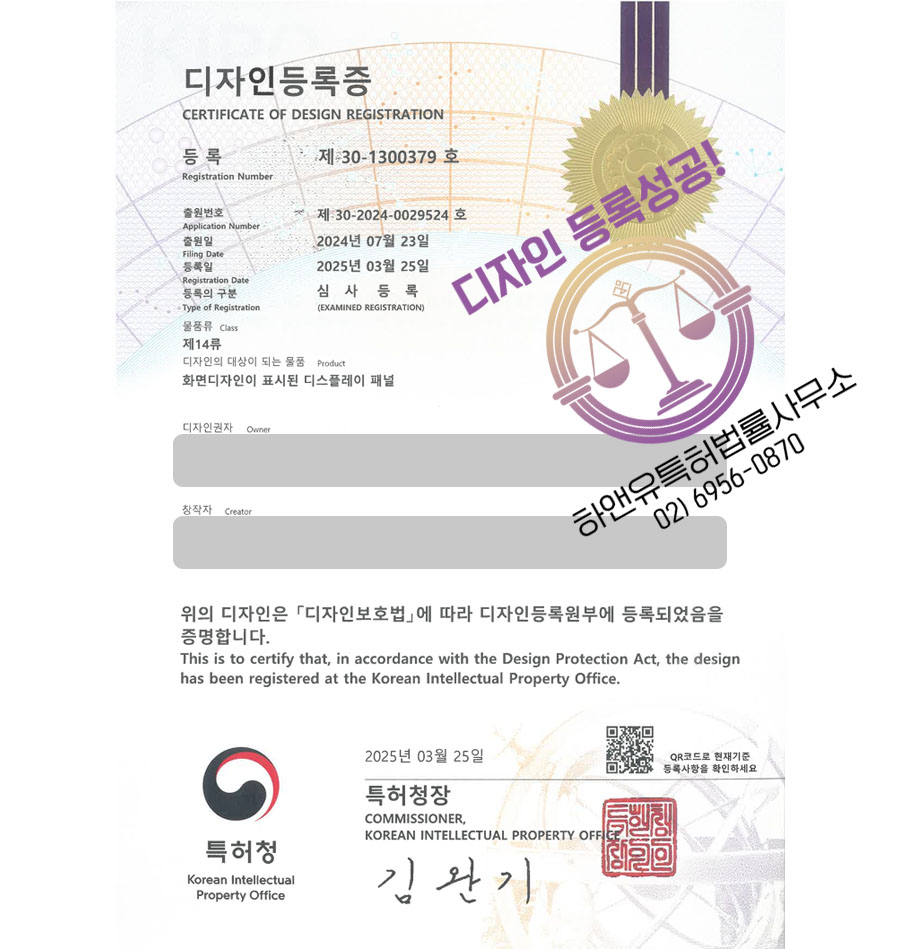 디자인심사를 통과하여, 최종적으로 ”화면디자인이 표시된 디스플레이 패널” 디자인등록에 성공하였습니다.