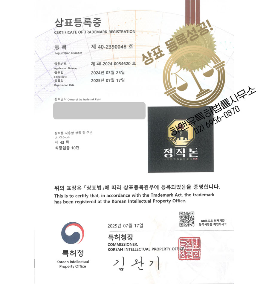 하앤유 상표 등록 성공! 식당업, 한식당, 음식점, 서비스업 상표권 디자인 특허 출원 ”정직돈” 상표
