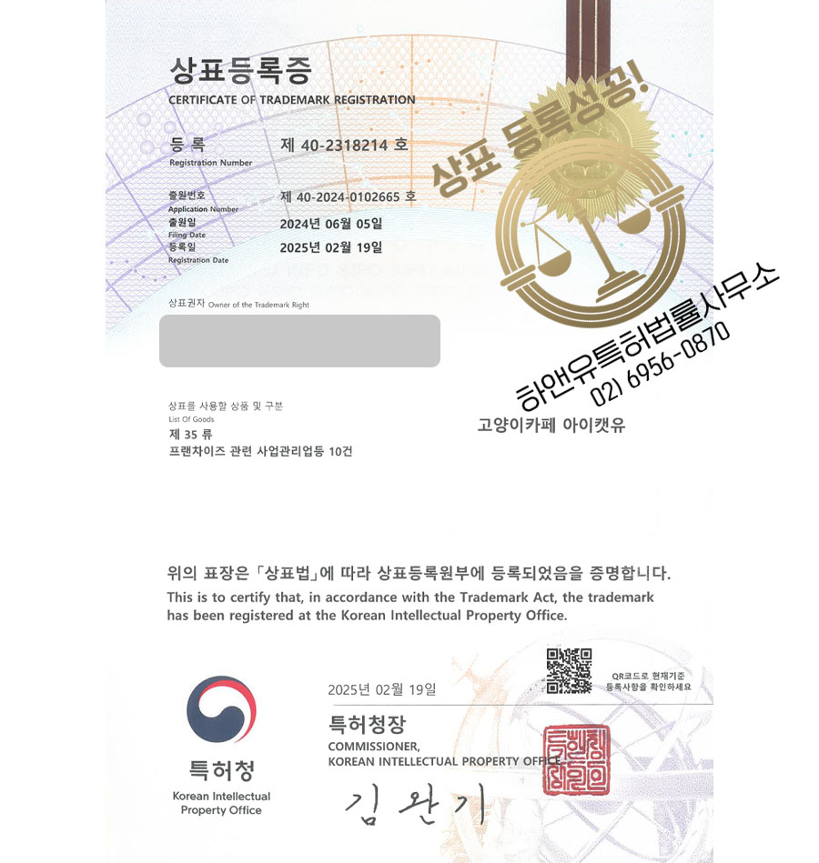 상표심사를 통과하여, 최종적으로 35류에 상표등록에 성공하였습니다.
