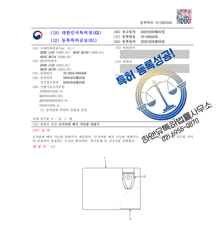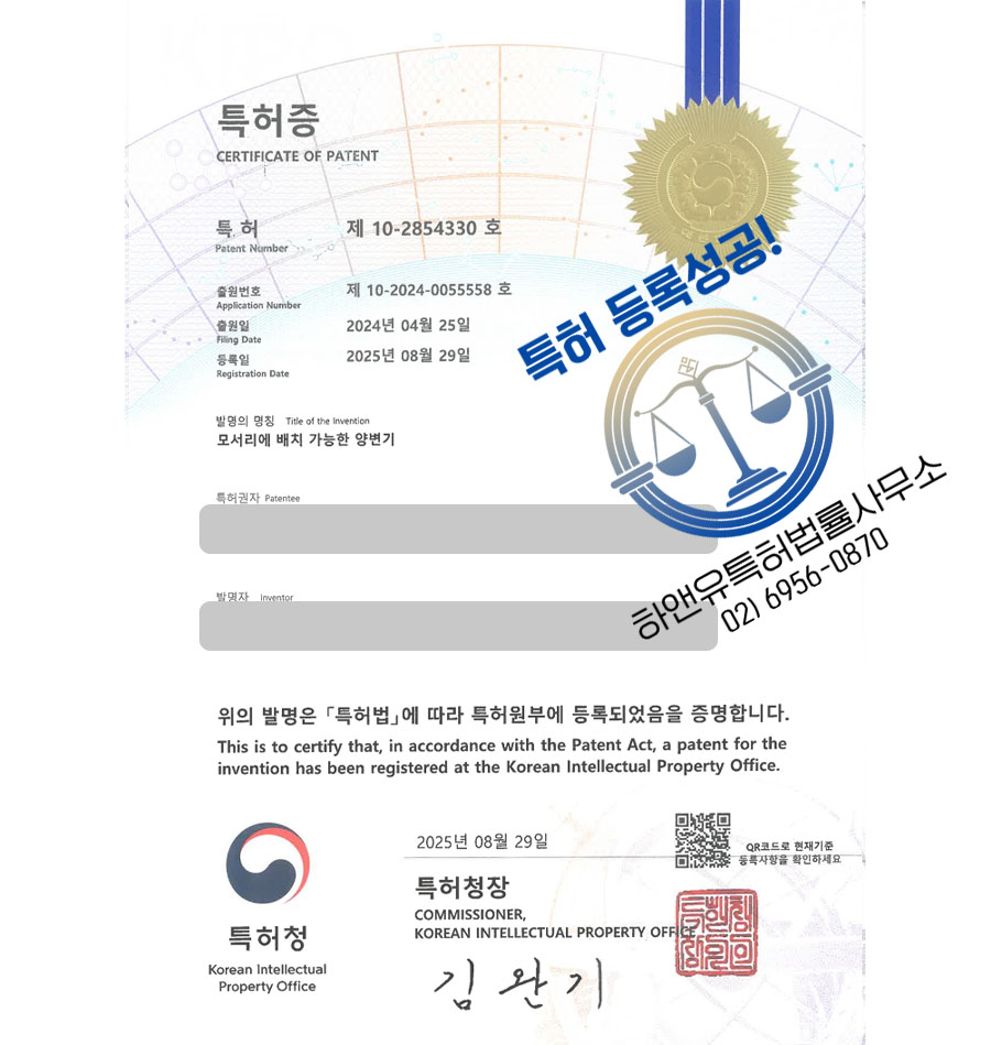 하앤유특허법률사무소에서 특허등록에 성공했습니다.