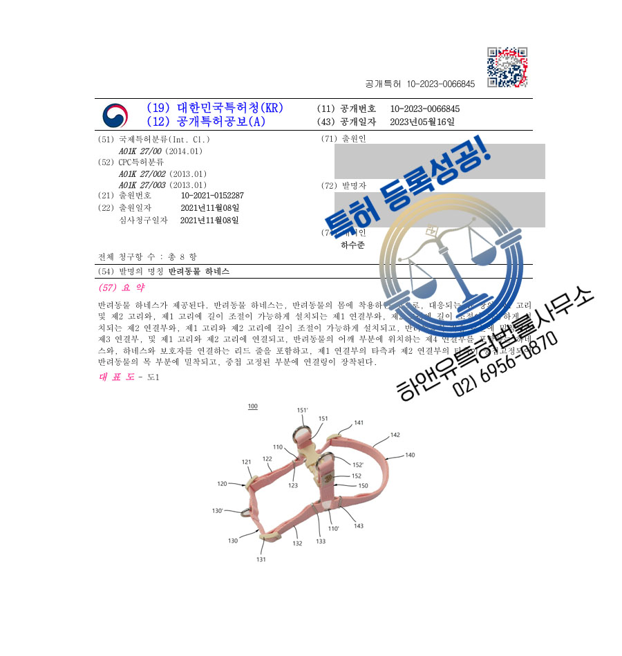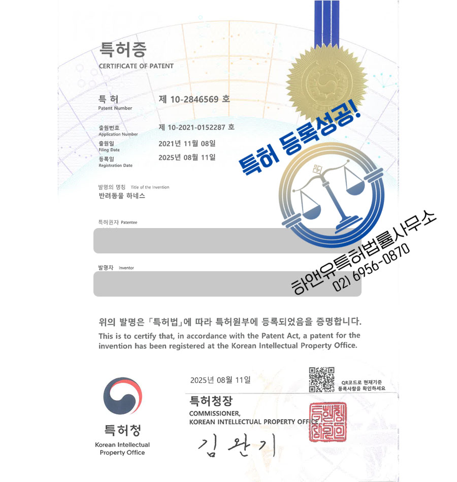 하앤유 특허 등록 성공사례 II ”반려동물 하네스” 특허권 등록 반려동물용품, 반려견, 강아지, 가슴줄 특허 출원