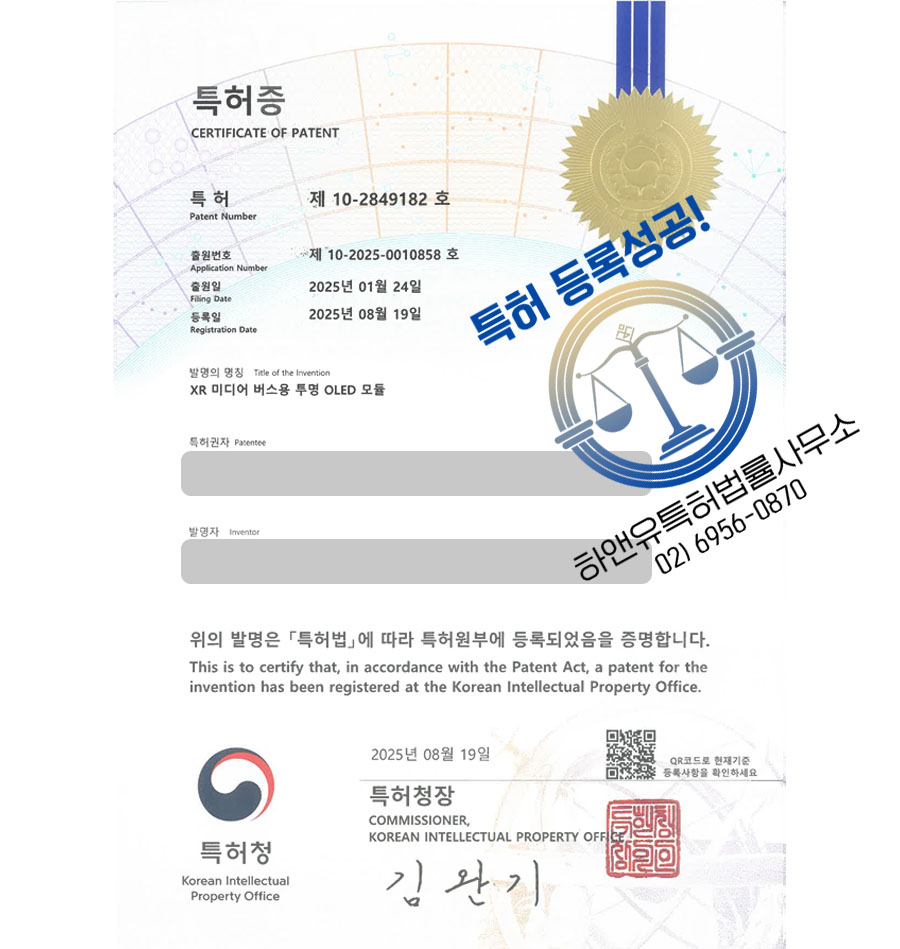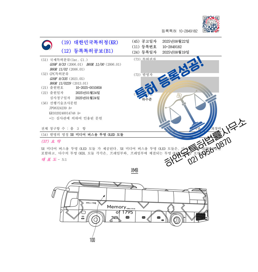 하앤유 특허 등록 성공사례 II ”XR 미디어 버스용 투명 OLED 모듈” 특허권 등록 3D 관광 체험 버스 특허 출원