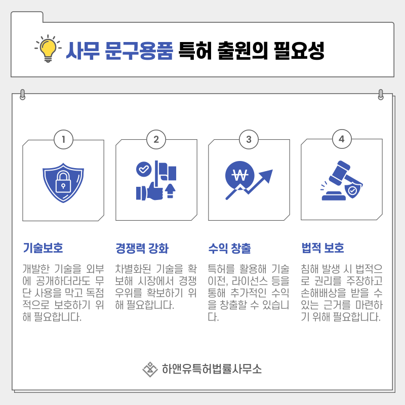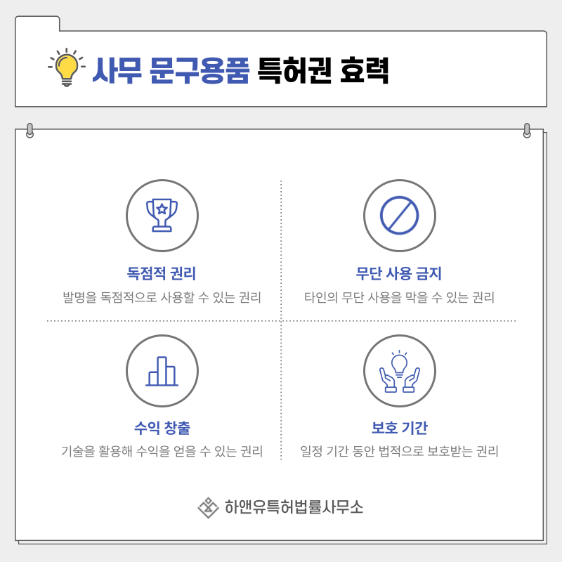 학용품, 문구, 필기구 특허권을 확보하면 해당 기술을 일정 기간 독점적으로 사용할 수 있는 권리가 발생합니다.