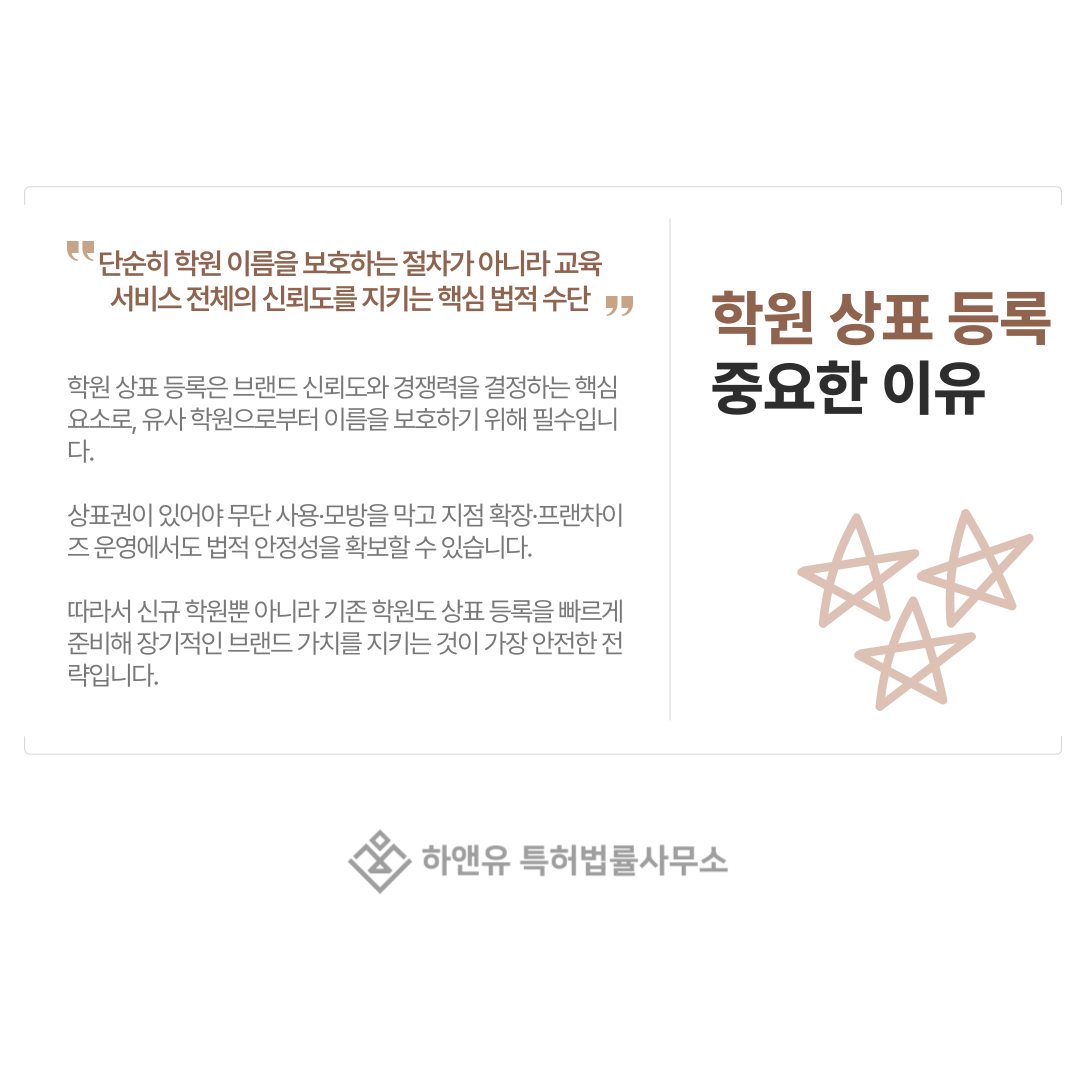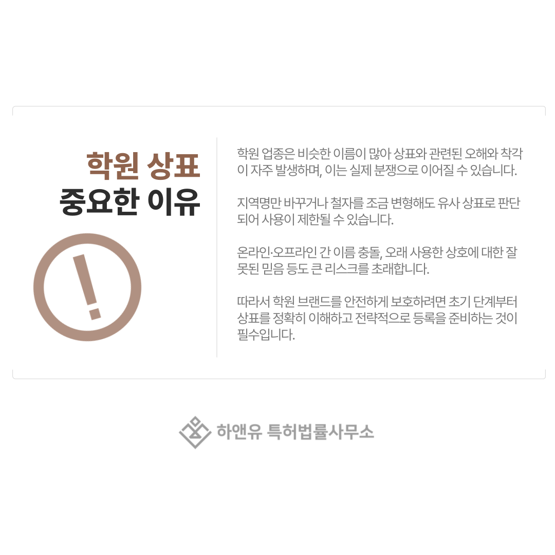 교육업은 동일하거나 유사한 이름이 쉽게 등장하는 분야이기 때문에 상표권이 없다면 다른 학원이 비슷한 이름을 사용하는 상황에 대응하기 어렵습니다.
