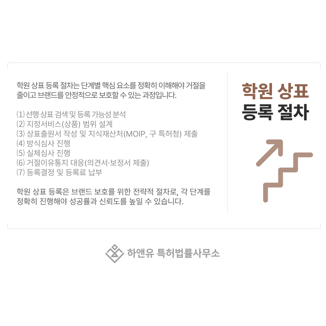 학원 상표 등록 절차는 단순히 서류를 제출하는 과정이 아니라, 브랜드를 법적으로 보호하기 위한 전략적 과정입니다.