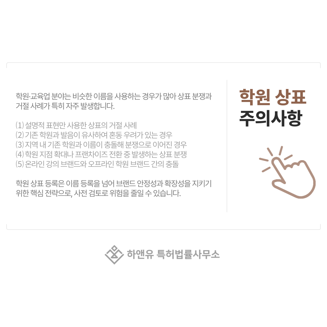 학원·교육업 분야는 비슷한 이름을 사용하는 경우가 많아 상표 분쟁과 거절 사례가 특히 자주 발생합니다.