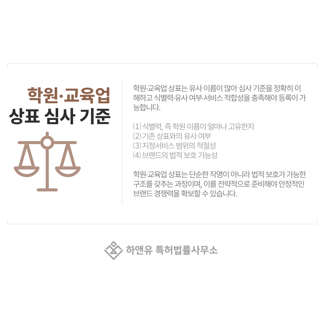 특히 최근에는 학원과 온라인 강의 플랫폼을 함께 운영하는 경우가 많아 상표 보호 범위 설계가 더욱 중요해졌습니다.