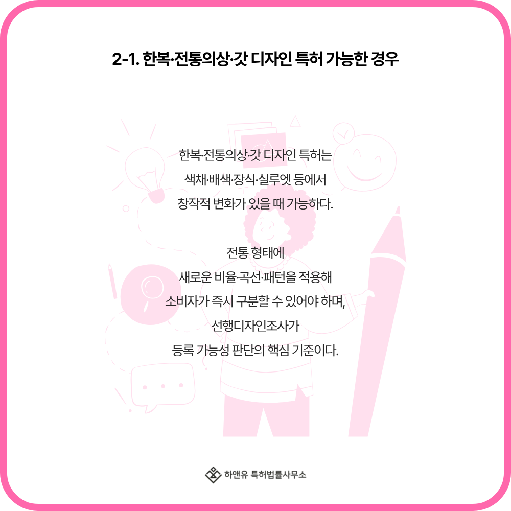 ■ 2-1. 한복·전통의상·갓 디자인 특허 가능한 경우 — 창의적 배색·장식·형상 변화