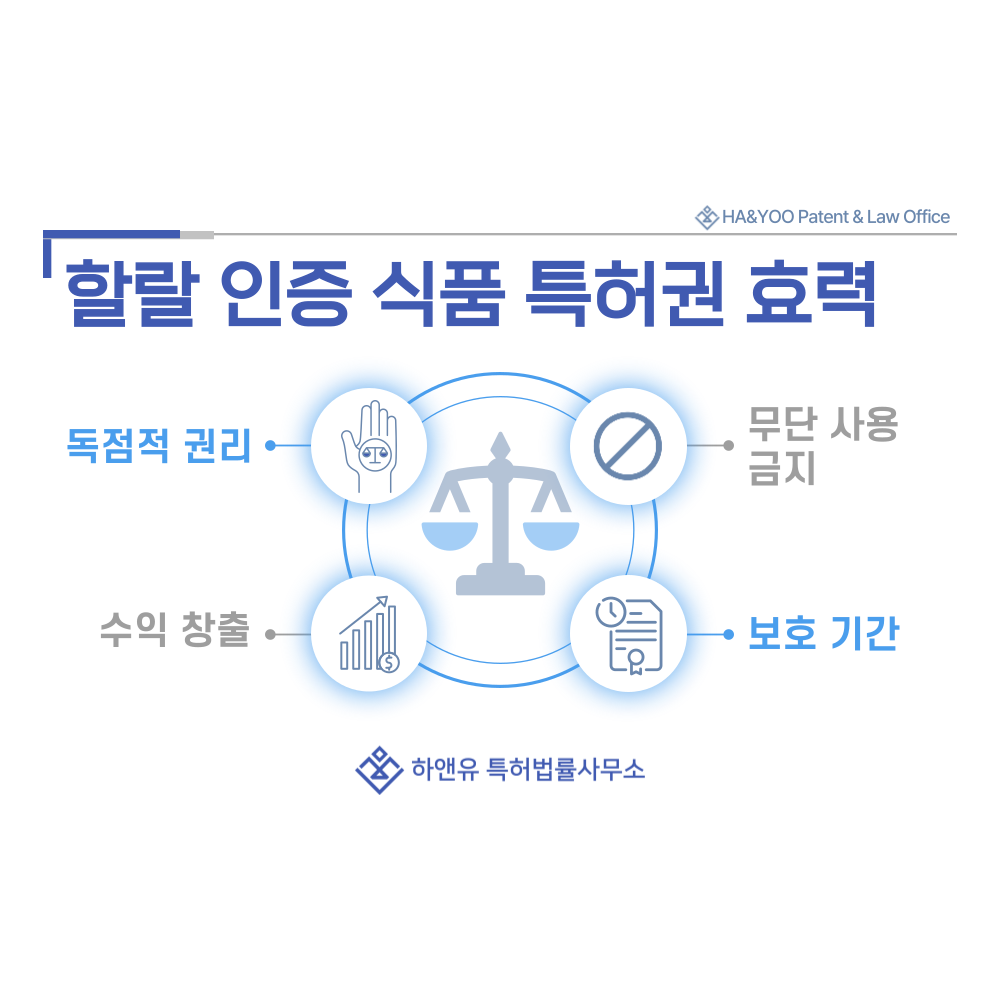 할랄 인증 식품·육가공·해산물 기술이 특허로 등록되면 자비하 공정, 타이예브 원료 관리 방식, 위생·추적 시스템 등 핵심 기술을 배타적으로 사용할 수 있는 독점적 권리가 부여됩니다.