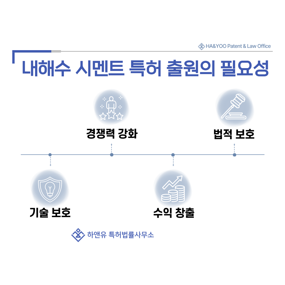 이처럼 해양구조물용 시멘트 특허 출원은 해양 환경에서도 안전하고 오래 지속되는 구조물을 만들 수 있는 기술적 차별성을 보호하고, 건설 산업에서의 활용 가치를 법적으로 확보할 수 있는 중요한 절차입니다.