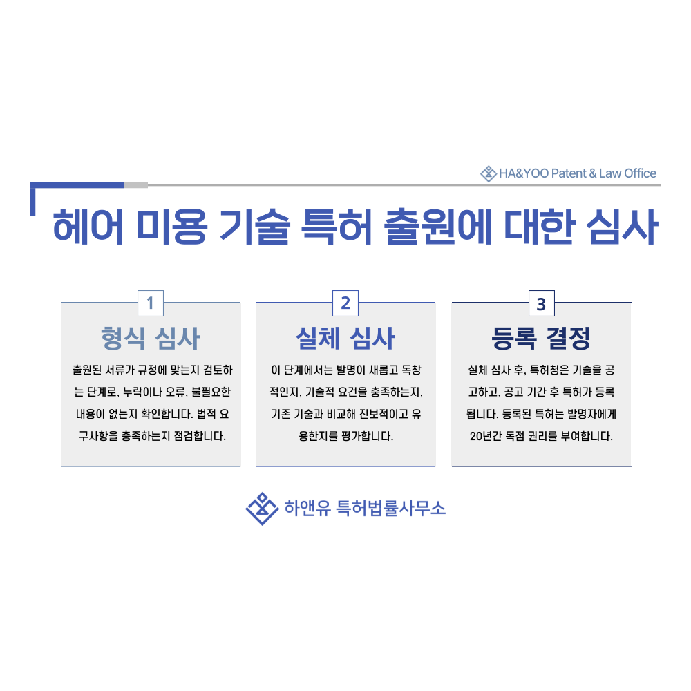신규성, 진보성, 산업적 이용 가능성이 있는지, 즉 기존 커트·펌·염색·트리트먼트 기술과 비교해 정말 새로운 효과와 구조, 방법이 있는지가 중점적으로 검토됩니다.