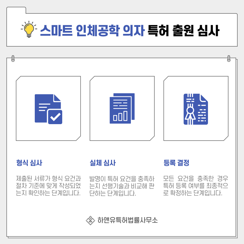이 단계에서는 신규성, 진보성, 산업적이용가능성을 중심으로 스마트 의자 기술이 특허로 보호될 수 있는지를 판단합니다.