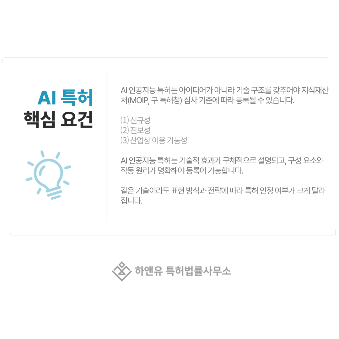 지식재산처(MOIP, 구 특허청)는 AI 인공지능 기술 역시 일반 특허와 동일한 기준으로 엄격하게 판단합니다.