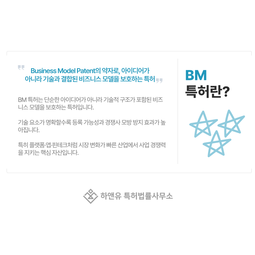 BM 특허는 Business Model Patent의 약자로, 단순한 아이디어가 아니라 기술과 결합된 비즈니스 모델을 보호하는 특허를 의미합니다.