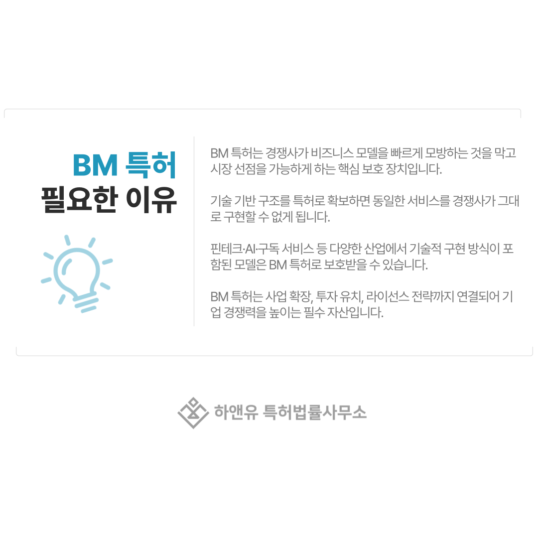BM 특허는 단순한 아이디어 보호가 아니라 기술이 결합된 서비스 운영 방식을 권리화하는 것이기 때문에, 확보해두면 경쟁사는 동일한 구조를 그대로 사용할 수 없습니다.