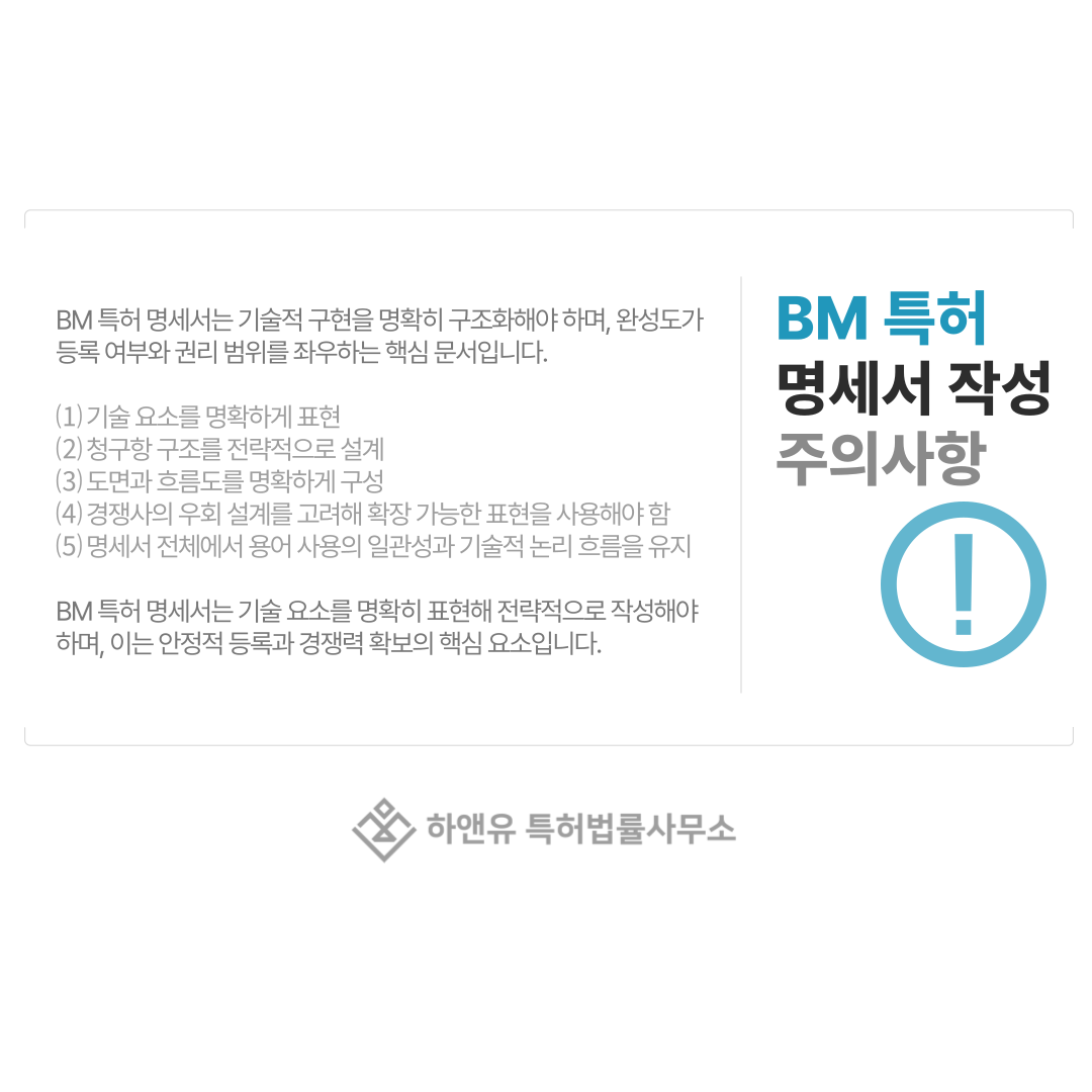 명세서의 완성도에 따라 BM 특허의 등록 가능성뿐 아니라 권리 범위까지 결정되기 때문에 작성 단계에서 특히 세심한 주의가 필요합니다.