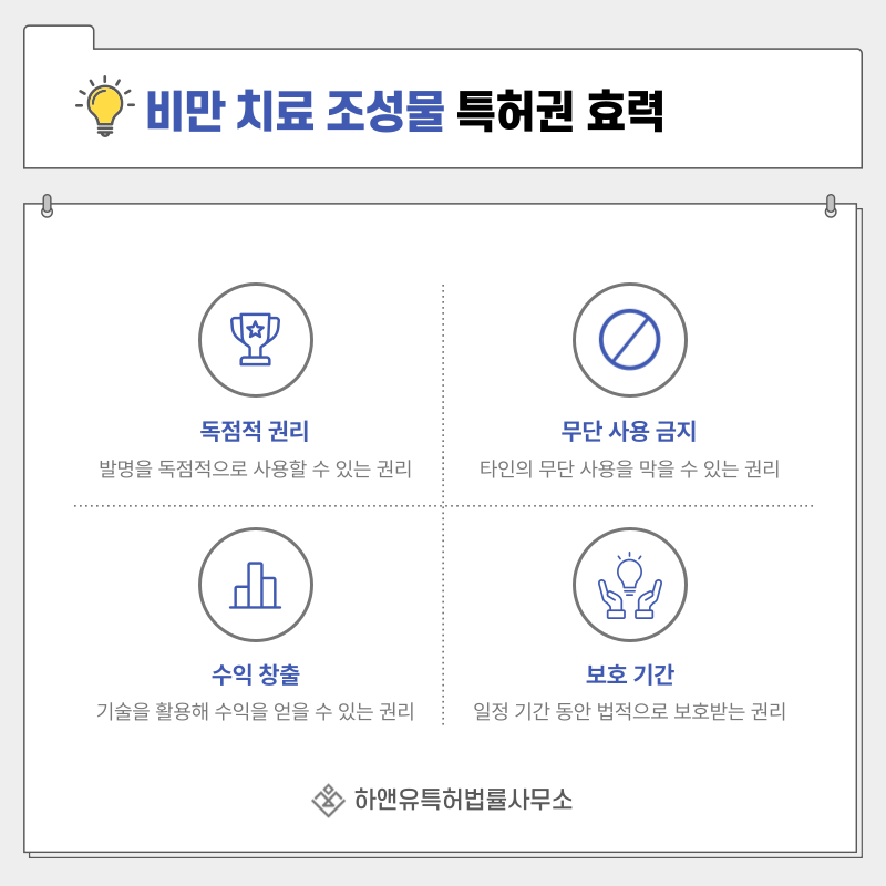 이는 동일하거나 유사한 작용 기전, 투여 방식, 제형 구조를 타인이 함부로 사용할 수 없도록 하는 강력한 권리입니다.
