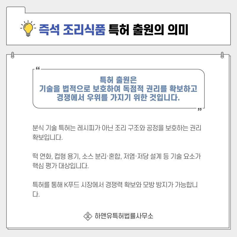 단순한 음식 레시피를 보호하는 것이 아니라, 즉석조리와 대량생산에 적합한 구조와 공정을 권리로 확보하는 과정입니다.