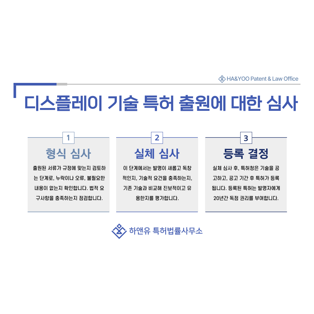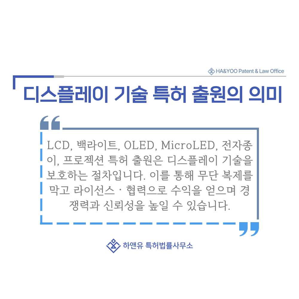#디스플레이기술 #LCD #백라이트 #OLED #MicroLED #전자종이 #프로젝션 #특허 #특허출원 #특허등록 #특허권 #하앤유 #특허변리사 #PatentRegistration #PatentApplication