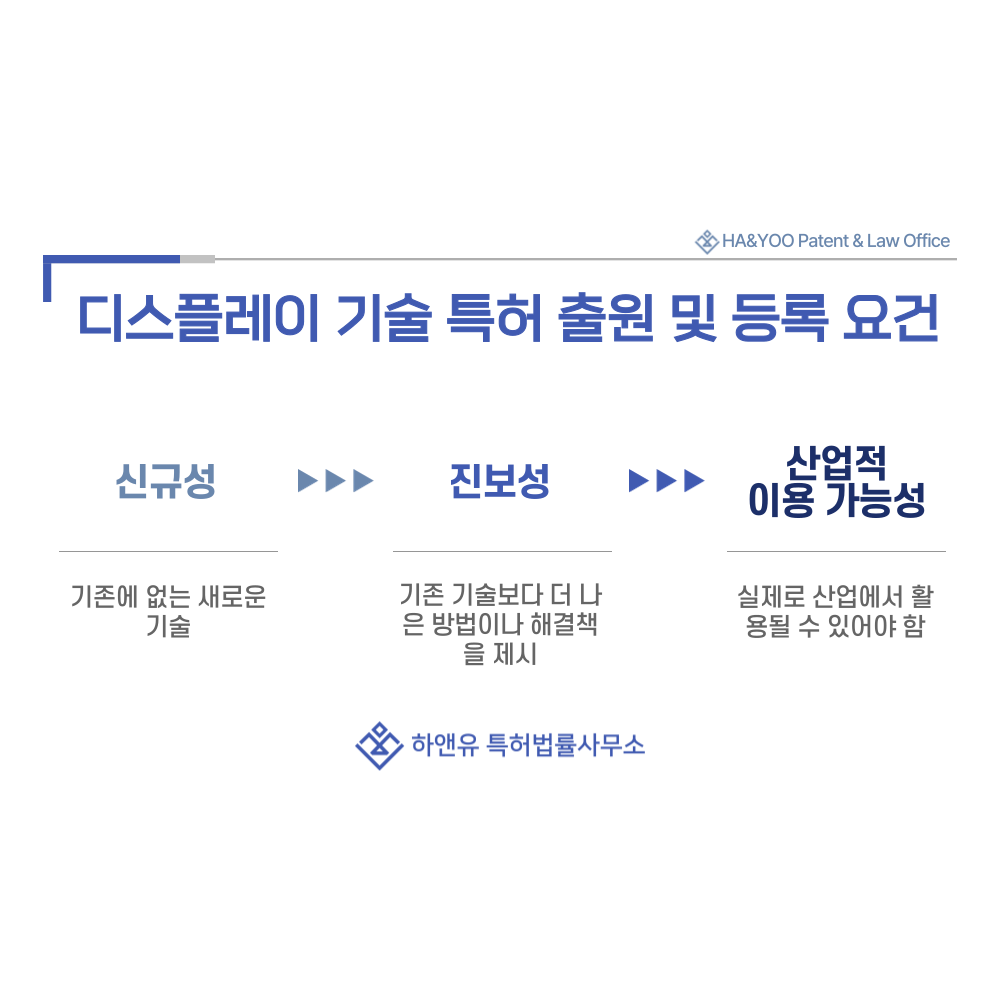 신규성, 진보성, 산업적 이용가능성이 핵심 기준이며 기존 디스플레이 기술과의 차별성을 따집니다.