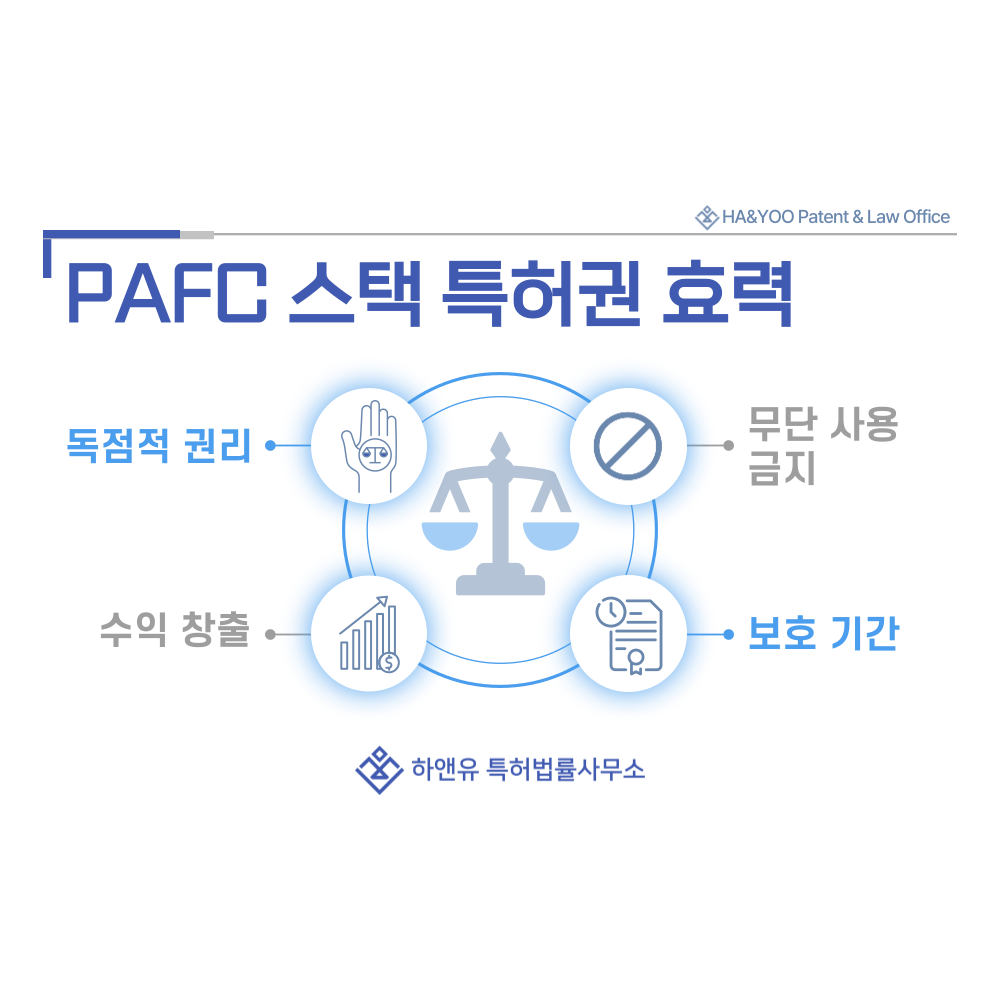 특허권은 타인이 허락 없이 기술을 사용할 수 없도록 법적으로 보호합니다. 만약 무단으로 기술을 활용할 경우, 특허침해로 간주되어 손해배상 청구, 침해 금지 소송 등 법적 대응이 가능합니다. 이는 PAFC 스택 개발 과정에서 축적된 기술적 노하우와 연구·개발 투자를 보호하는 중요한 수단으로, 권리자의 기술 독점과 시장 지위를 안정적으로 유지하는 역할을 합니다.
