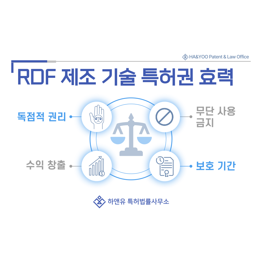 RDF 제조 기술에 대한 특허권을 취득하면, 출원인이 해당 기술을 독점적으로 사용할 수 있는 권리를 갖게 됩니다. 즉, 다른 사람이 동일한 공정, 장치, 배합 방법 등을 허락 없이 제조, 사용, 판매할 수 없으며, 기술적 우위를 확보할 수 있습니다. 이를 통해 경쟁사와 차별화된 기술력을 유지하고, 산업적 활용에서 독점적 지위를 확보할 수 있습니다.