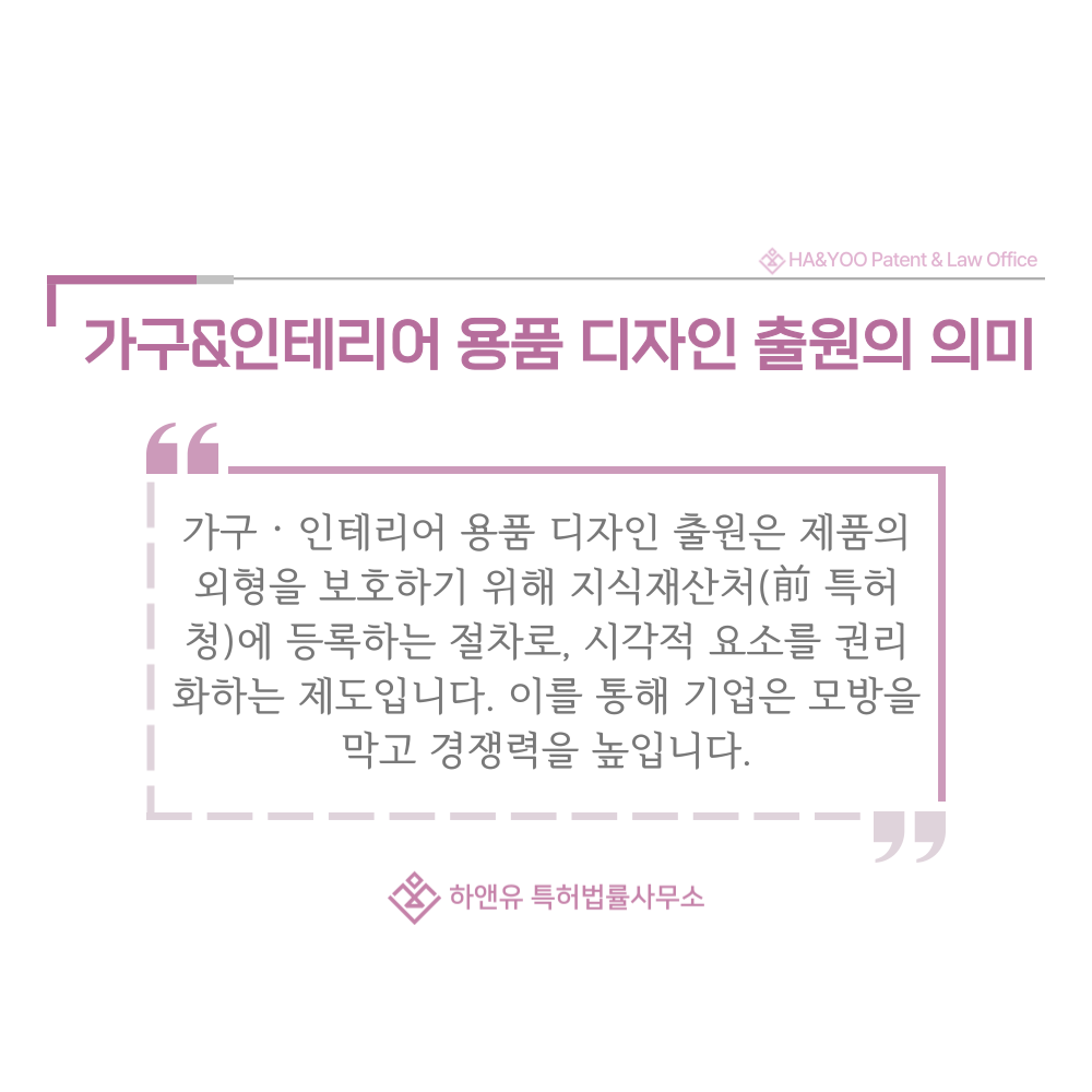따라서 디자인 출원은 가구나 인테리어 제품의 고유한 형태와 감각을 안정적으로 보호하는 핵심 수단이 됩니다.