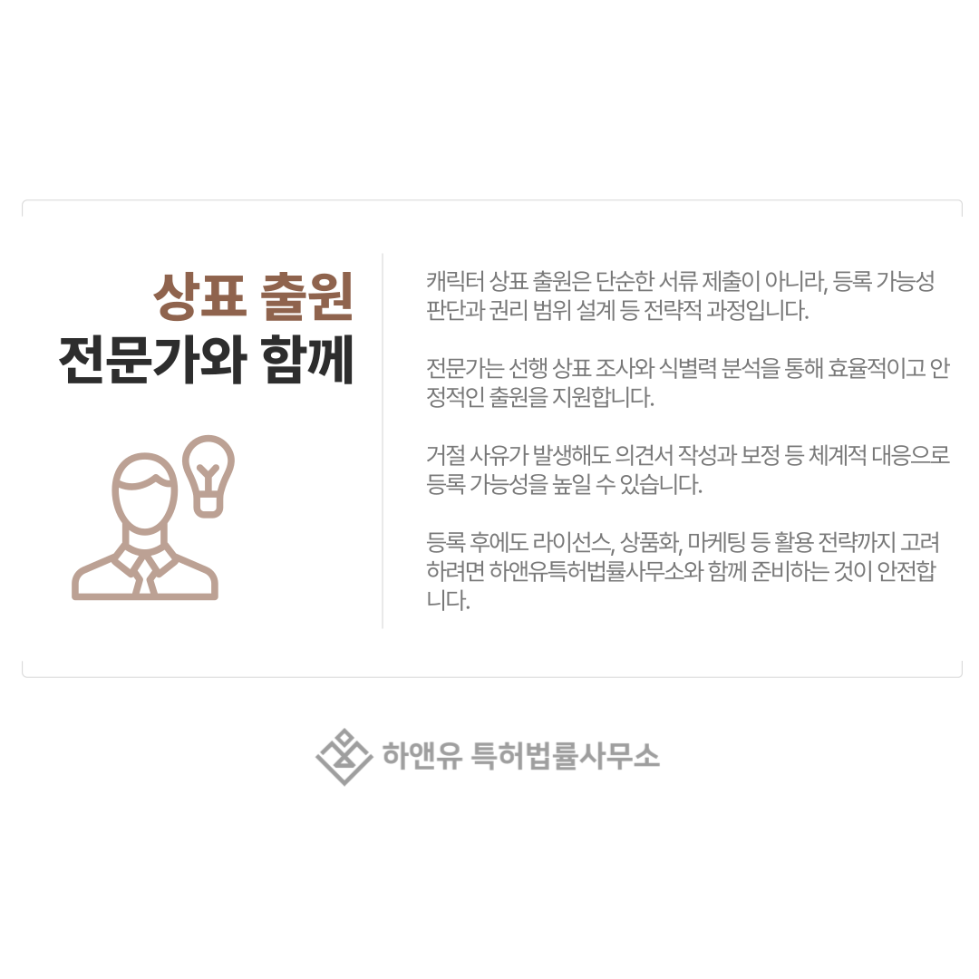 캐릭터 상표 출원과 관련해 안정적인 등록과 전략적 활용을 모두 확보하고 싶다면,