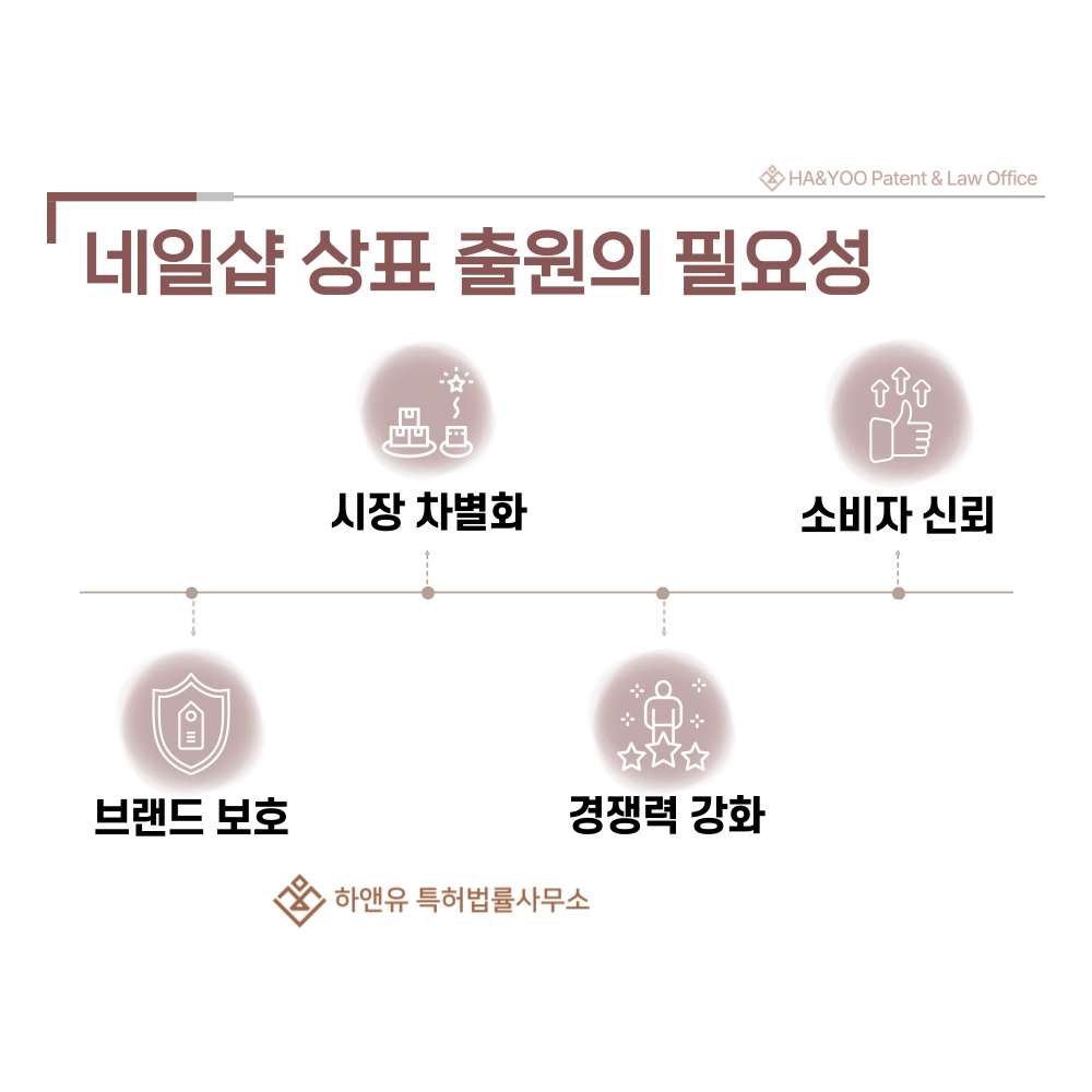 따라서 상표권은 네일샵 브랜드를 보호하면서 경쟁 환경에서 주도권을 확보할 수 있는 가장 강력한 법적 수단입니다.