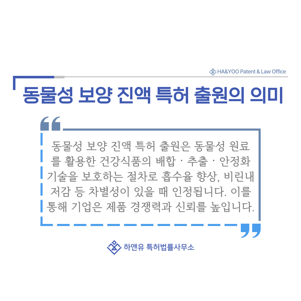 1. 동물성 보양 진액, 녹용, 사슴, 오리, 한우, 추어, 삼계 진액, 즙 조성물 특허 출원의 의미