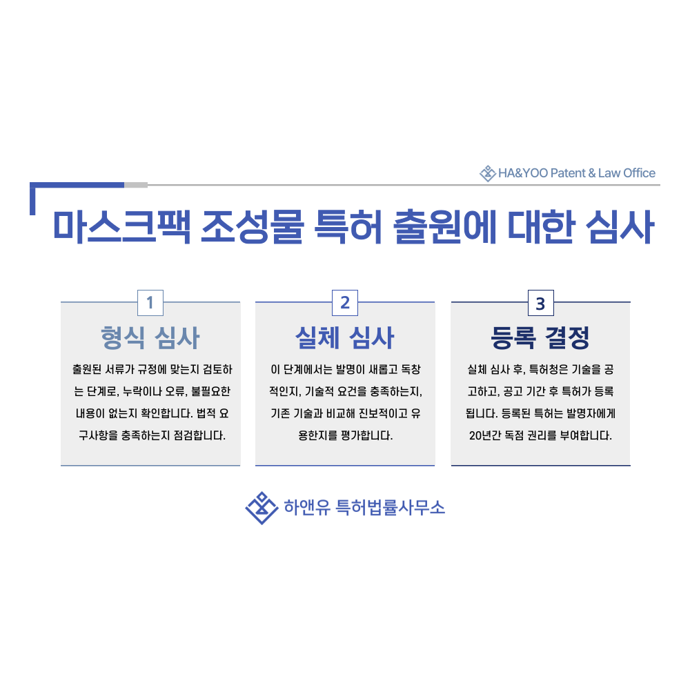 심사관은 선행기술과 비교해 마스크 팩·시트·필오프·슬리핑 팩 기술이 얼마나 새로운지, 기존 기술 대비 발전된 구조가 있는지, 실제 제품 생산이 가능한지를 판단합니다.