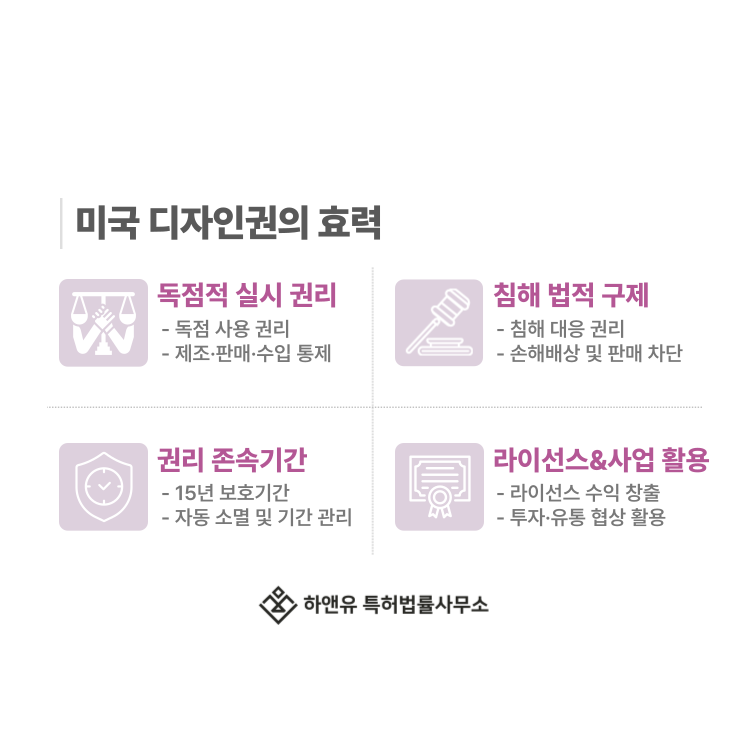 미국 디자인권이 등록되면 해당 디자인을 독점적으로 사용할 권리가 발생합니다.
