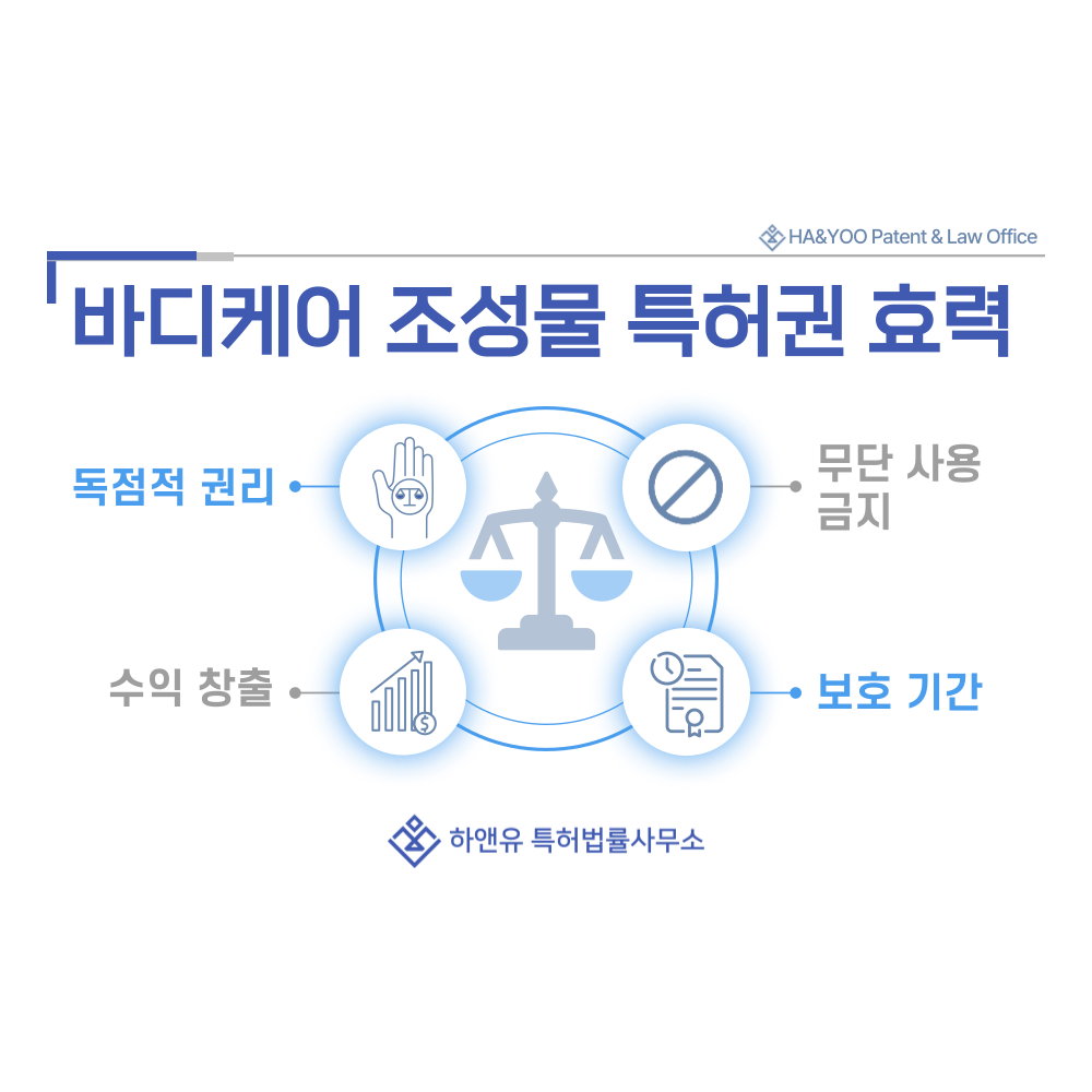 바디워시·샤워젤·바디 스크럽·입욕제 조성물의 특허권이 등록되면, 발명자는 해당 기술을 독점적으로 사용할 수 있는 권리를 가집니다.