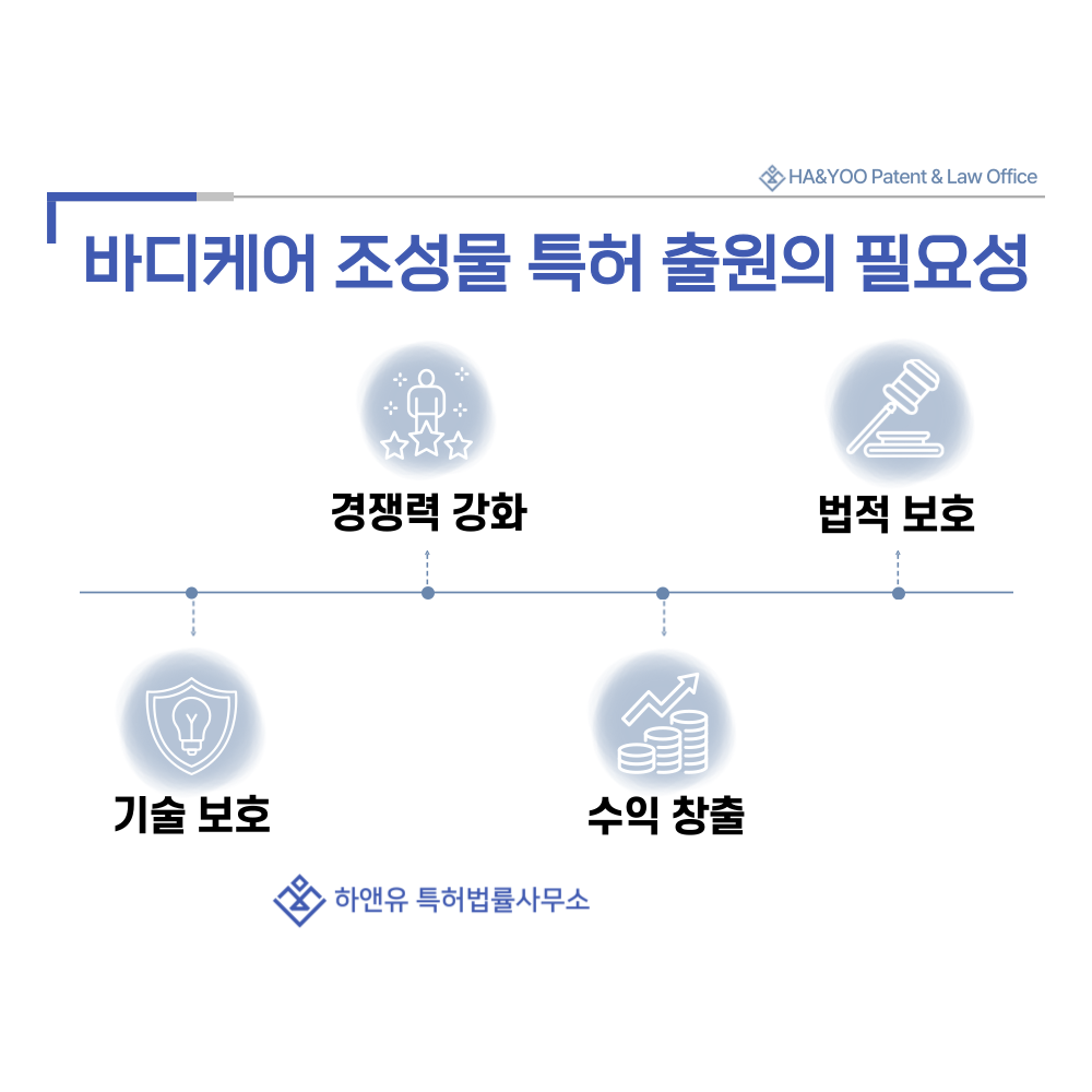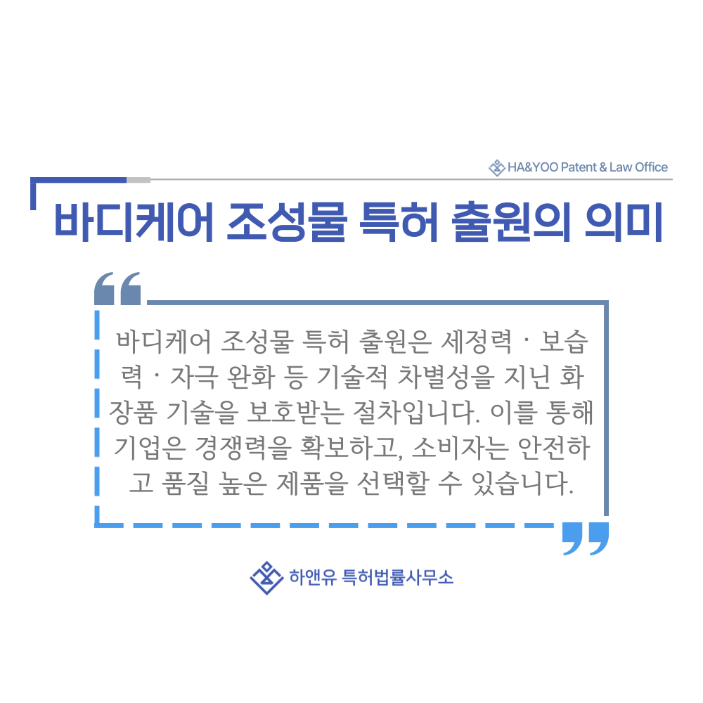 바디워시·샤워젤·바디 스크럽·입욕제 조성물 특허 출원이란 피부 세정과 관리 기능을 개선하기 위한 화장품 기술을 법적으로 보호받기 위해 지식재산처(前 특허청)에 신청하는 절차를 말합니다.