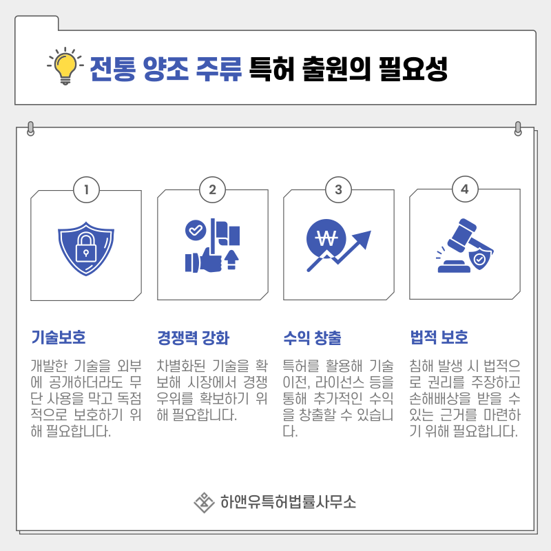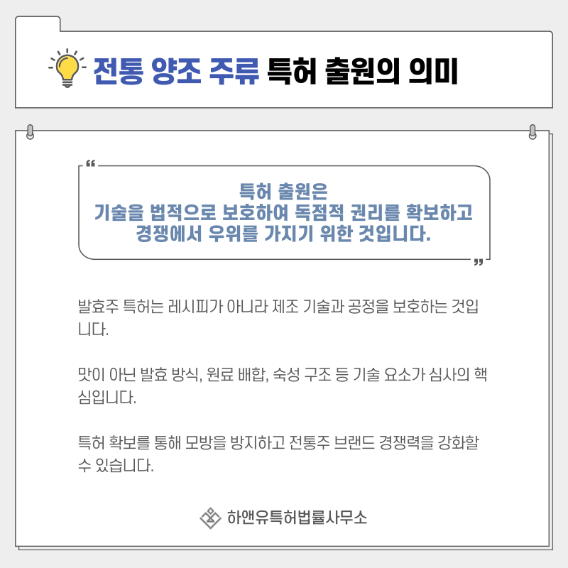 특히 전통주나 지역특산주는 스토리와 기술이 결합된 시장이기 때문에 기술 보호 여부가 브랜드 신뢰도에 직접적인 영향을 미칩니다.