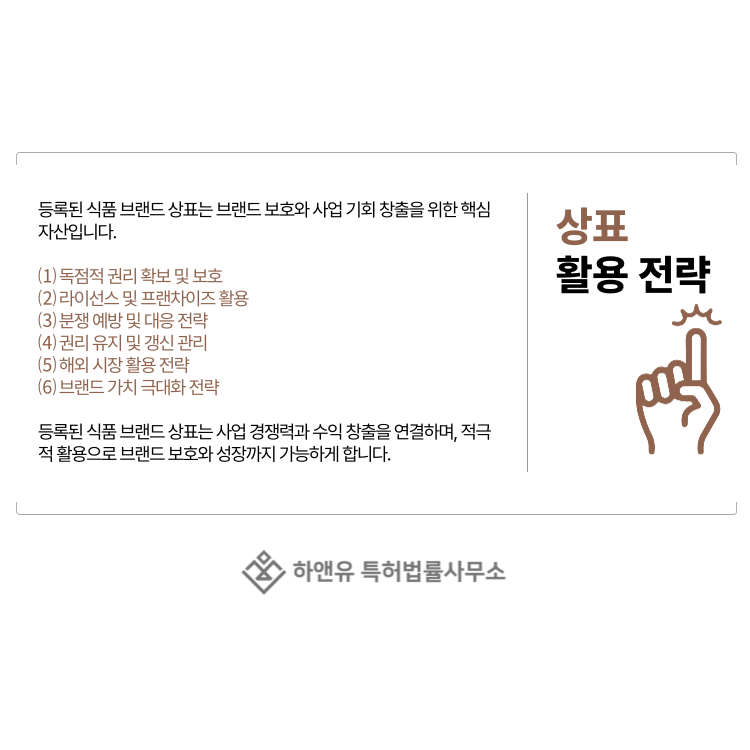 #식품브랜드 #상호등록 #브랜드보호 #식품상표 #외식업상표 #상표전문가 #상표관리 #프랜차이즈상표 #브랜드권리 #해외상표출원 #상표전략 #사업경쟁력 #상표 #상표권 #상표출원 #상표등록 #TrademarkRegistration #TrademarkApplication #특허사무소 #특허법률사무소 #하앤유특허법률사무소