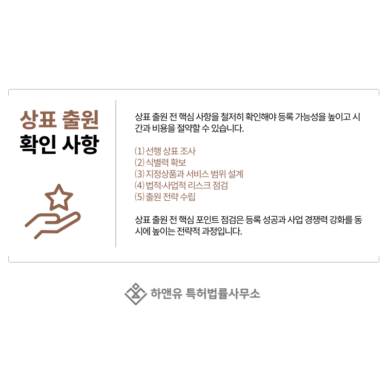 상표 출원 전 위 핵심 포인트를 점검하면, 등록 가능성을 높이고 사업적 활용 가치도 극대화할 수 있습니다.