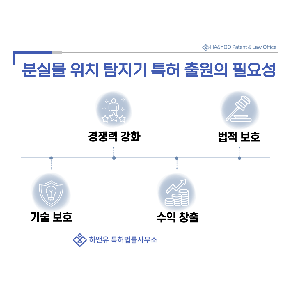 분실물 위치 복원 탐지기는 GPS, 무선통신, 환경 데이터 분석 등 다양한 기술이 융합된 고도화된 장치이기 때문에, 개발 과정에서 축적된 기술 노하우가 그대로 유출될 위험이 있습니다. 특허 출원을 통해 해당 기술의 구조, 동작 방식, 알고리즘 등을 법적으로 고유한 권리로 인정받으면, 타인이 무단으로 복제하거나 유사 기술을 사용하는 것을 효과적으로 방지할 수 있습니다. 이는 장기간의 연구·개발 성과를 안정적으로 지키는 첫걸음이 됩니다.