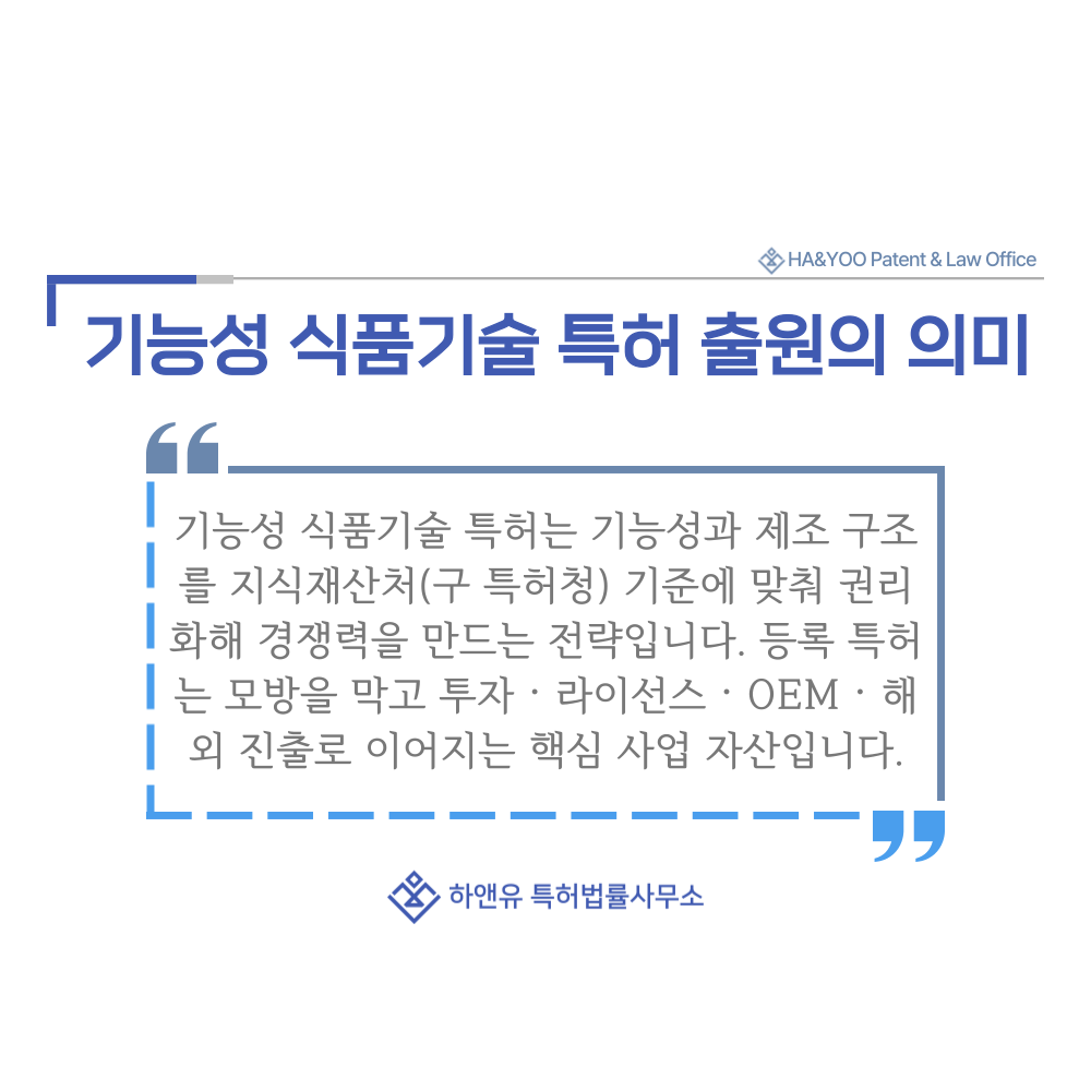 특히 기능성 식품 시장은 유사 제품이 빠르게 늘어나기 때문에 초기 단계에서 기술 보호가 매우 중요합니다.
