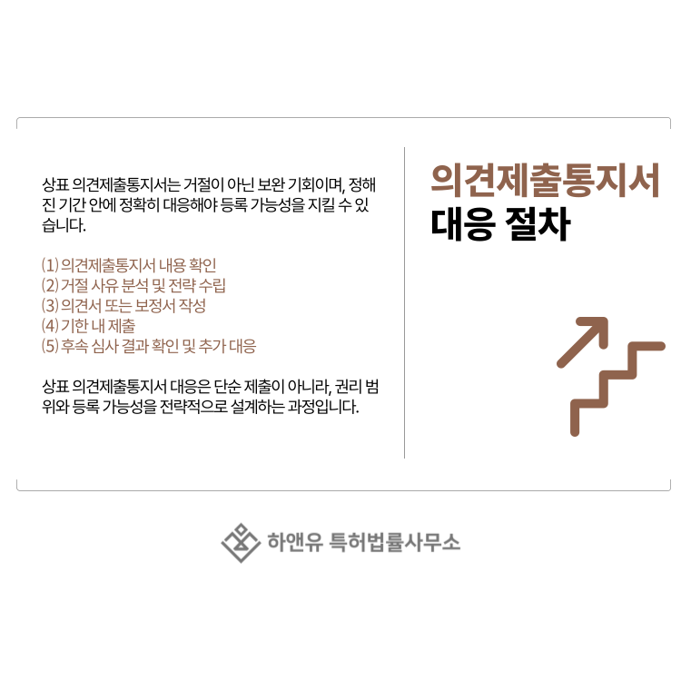 이 모든 과정은 단순히 서류를 내는 절차가 아니라 상표 등록 가능성을 다시 설계하는 전략 단계입니다.