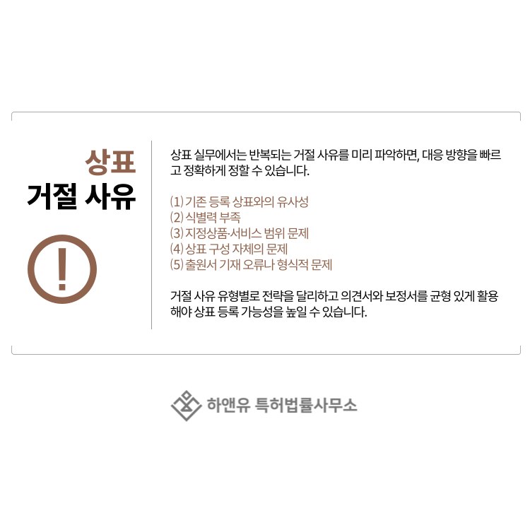 실제 상표 실무에서 의견제출통지서가 발생하는 경우를 살펴보면, 비슷한 유형의 거절 사유가 반복되는 것을 확인할 수 있습니다.