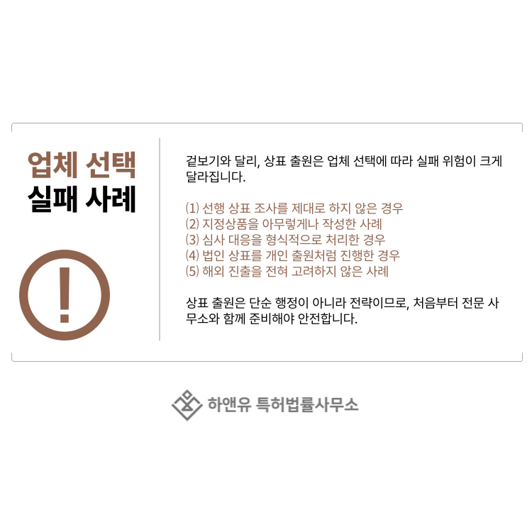 상표 출원을 아무 업체나 맡겼다가 실패하는 사례는 생각보다 훨씬 많습니다.