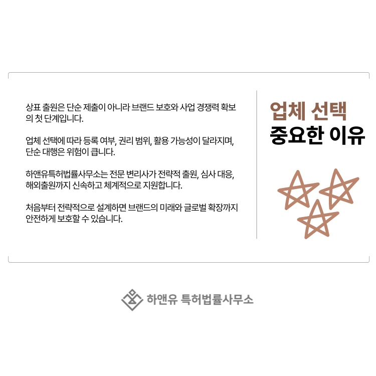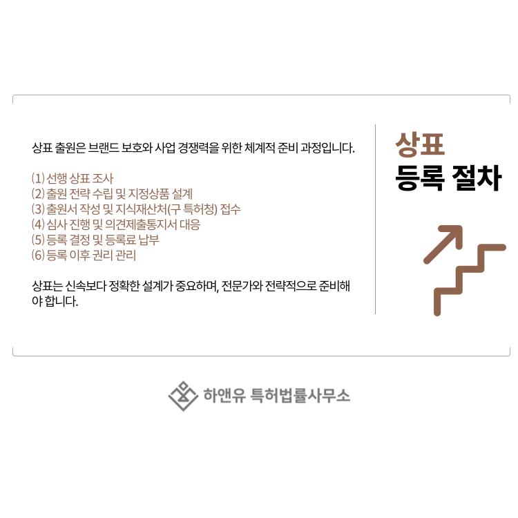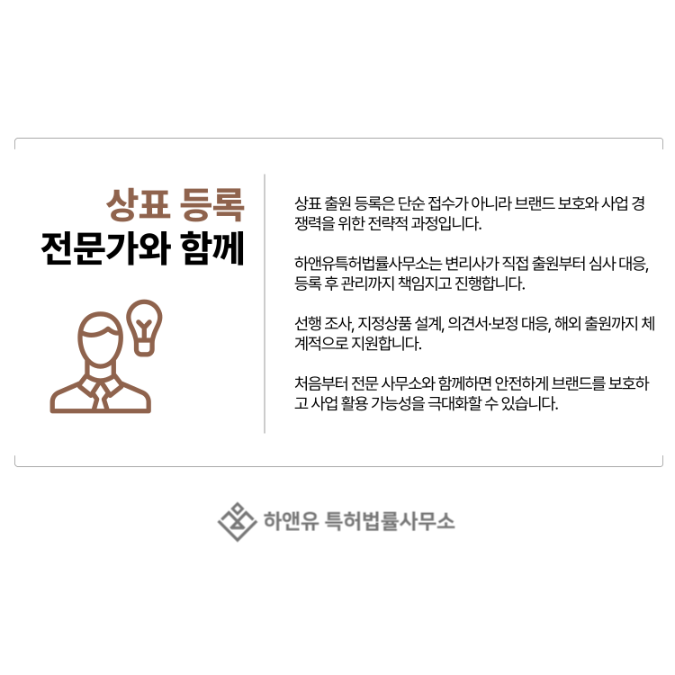 브랜드를 오래 지키고 싶다면 상표 출원 절차를 전문가와 함께 전략적으로 준비하시길 권해드립니다.
