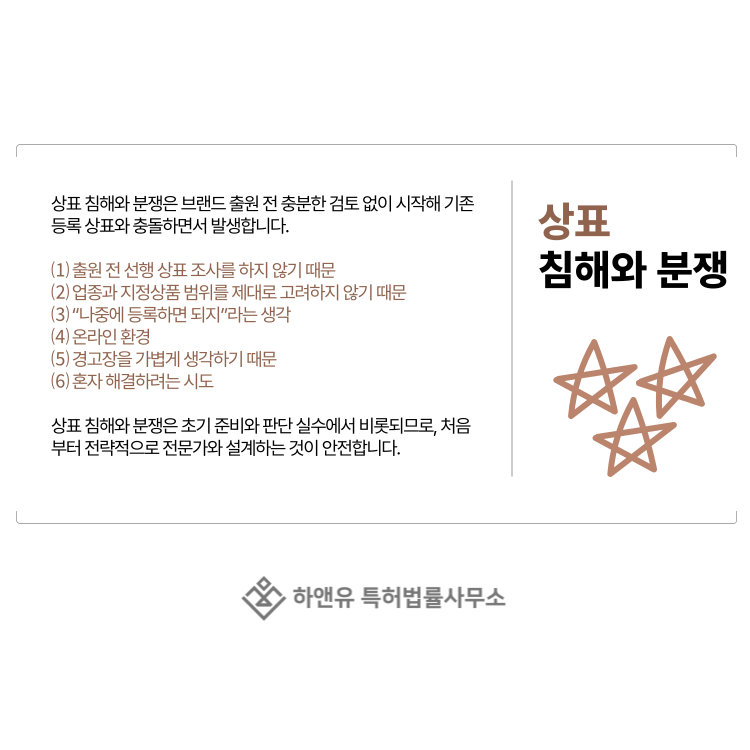 그래서 상표는 처음부터 전략적으로 설계하고, 문제가 생기기 전 전문가와 점검하는 것이 가장 안전한 방법입니다.